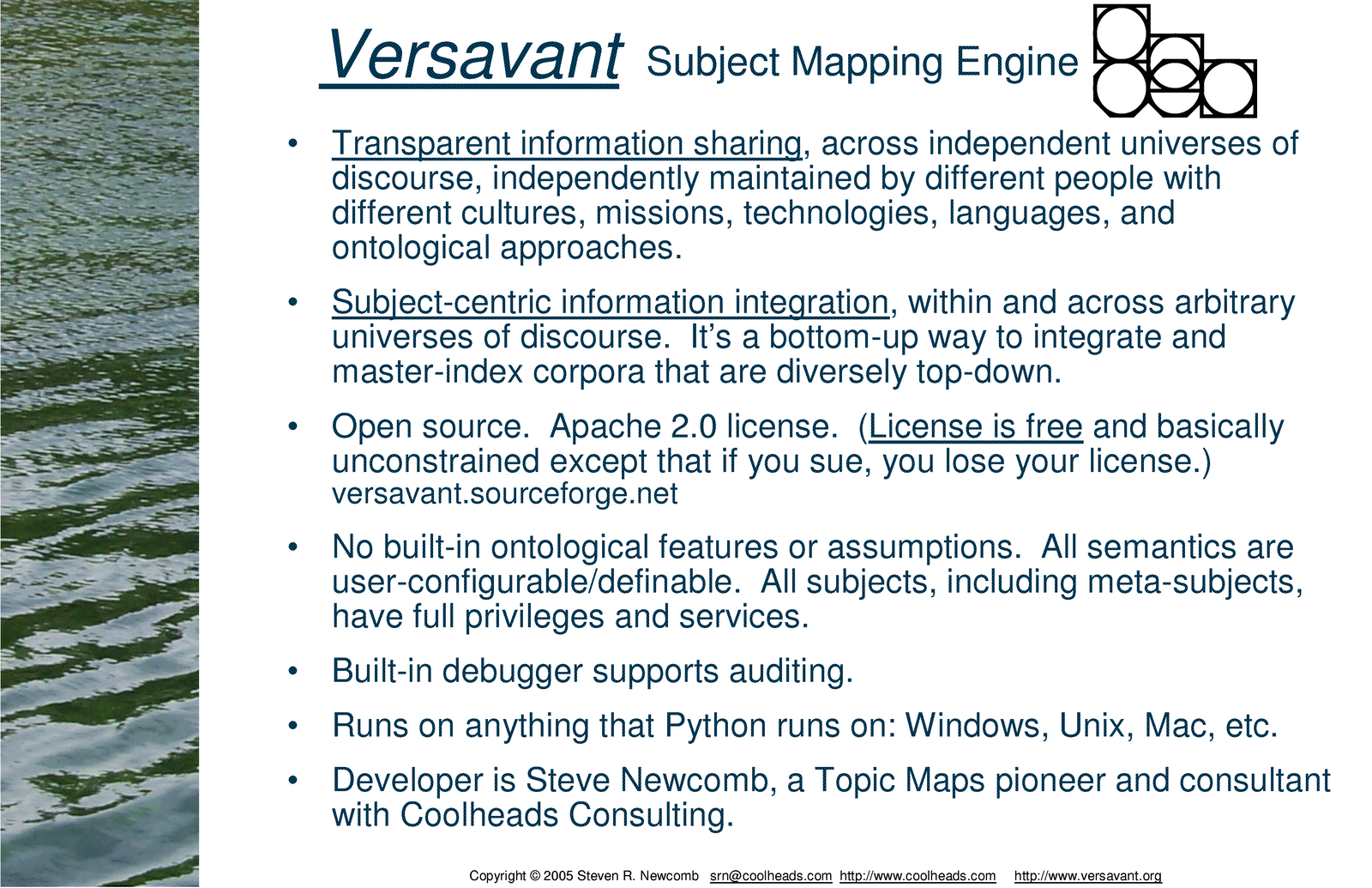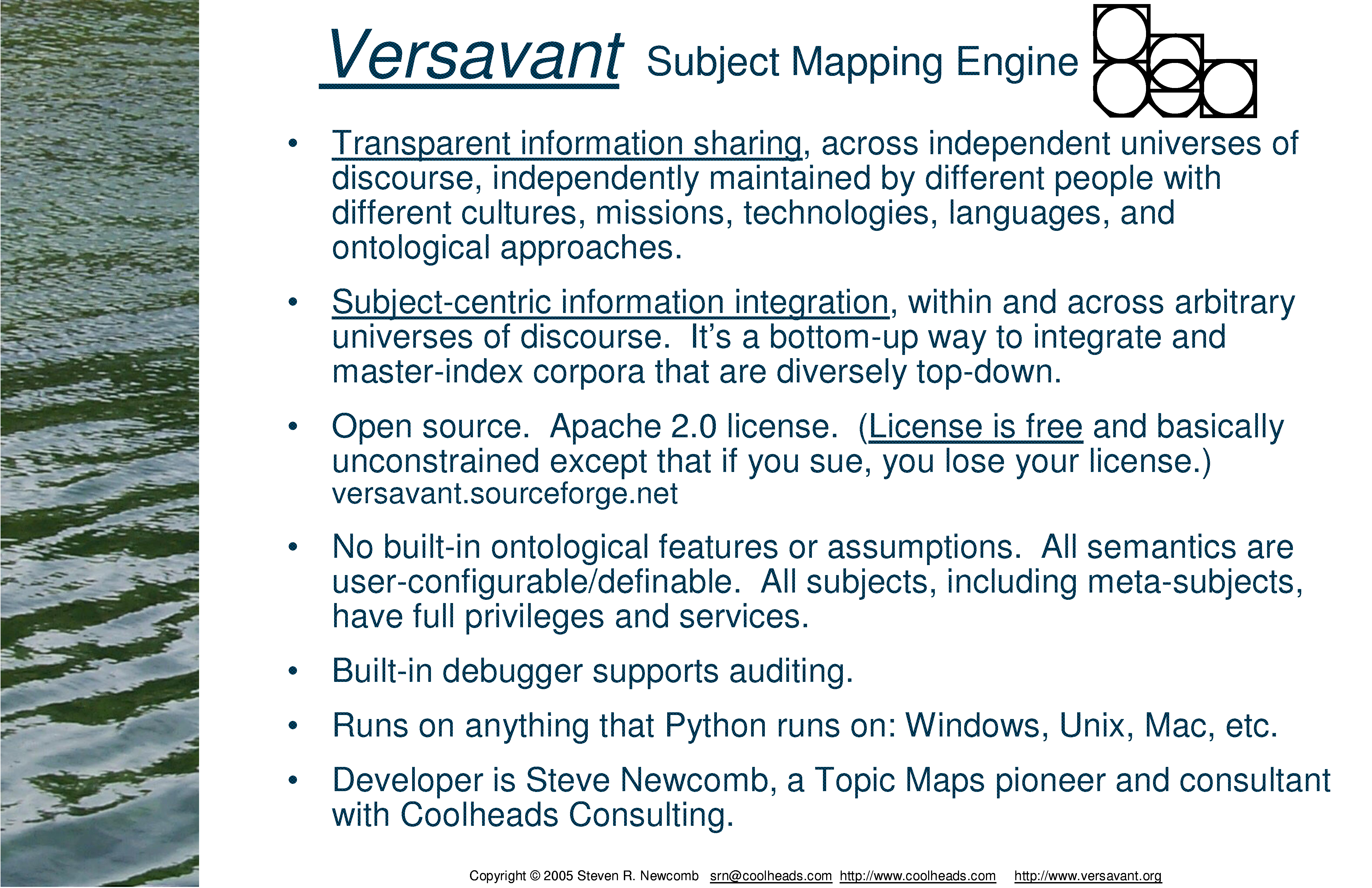 An open-source, Python implementation of a Versavant engine, "Versavant.py" is available at http://sourceforge.net/project/showfiles.php?group_id=136572&package_id=150168 and at http://www.versavant.org/releases/index.html. It can be used with predesigned TMAs. Users can also design their own TMAs, using either predesigned TMA component functions, or their own functions, or both. Topic maps that have been created using Versavant.py (either from scratch or by merging other topic maps) can optionally be exported in such a way that they encapsulate their governing TMAs. This makes them functionally self-describing and ready-to-merge with other topic maps; they are examples of "Smart Content". One of the features of Versavant.py is that its operations are easily audited; you can audit the chain of events that led to each property value of each subject proxy.
